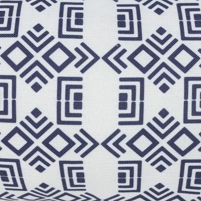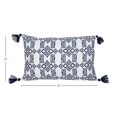 An intricate navy-blue geometric pattern is printed on a clean white base finished with blue and white combination tassels in each corner, tied together by a navy-blue backing. Paired with the classic blue and white coloration, the Southwest inspired design adds a bit of boho flair to your outdoor space. Made from recycled plastic bottles and UV stabilized, this lumbar pillow is suitable for both indoors and outdoors.