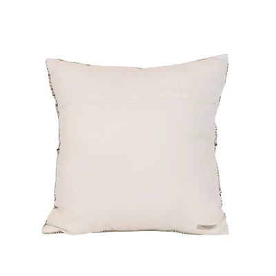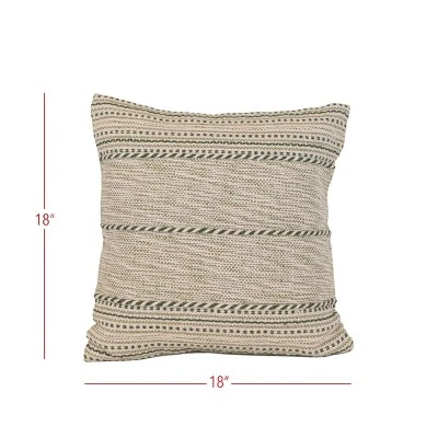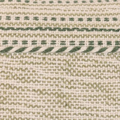 Tonal green yarns are woven into the off-white base of this pillow to create different stripe and dash patterns that elevate a cozy cabincore vibe. Braided green and white ropes add a textural boho chic element. Because this pillow is made from recycled plastic bottles, it is perfect for any living space both indoors and out.