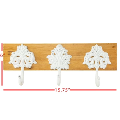 Enhance your traditional farmhouse decor with this gorgeous multi wall hook from Foreside Home & Garden. The warm natural wood base holds three slightly distressed white cast iron hooks, offering a timeless and functional addition to the home. The use of two alternating hook styles is a nod to the eclectic vintage style. A sturdy multi-hook hanger that doubles as a beautiful wall decor piece, the perfect organization option for an entryway, mud room, or bathroom.
