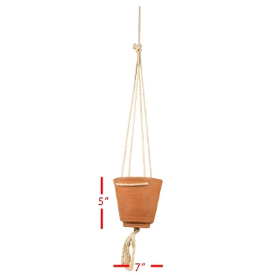 Exclusively from Foreside Home & Garden, a hanging terracotta pot that is a breeze to style with your favorite plants. Carefully crafted from natural terracotta clay, this tapered round planter is hand thrown by artisans in India. Detailed with a jute rope hanger that is tied around the pot and finished with a frayed jute tassel to create a visually stunning design, giving off casual boho vibes. Accent plants in the home or garden or make a statement with sprawling plants.