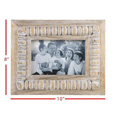 This beautiful, textural picture frame is the perfect piece to bring a traditional vibe to your space. The whitewashed mango wood with a turned wood style border is reminiscent of detailed vintage architecture. The neutral coloration offers a transitional look that fits with most decor styles. Add a special photo that you can hang on the wall or display on a tabletop or shelf.