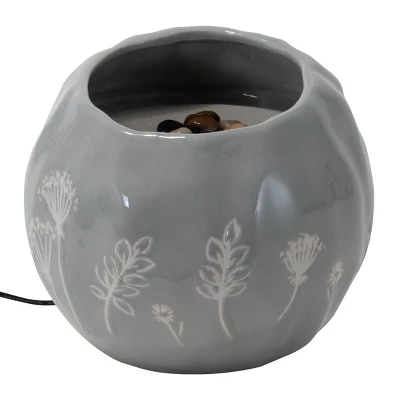 The Wildflower Fountain features a neutral gray glossy glaze with delicate botanical shapes revealing raw white clay underneath. Simple in shape, this orb fountain opens up at the top where the tranquil water bubbles over small pebbles. Refined, textural, and neutral, this is a great transitional fountain to add a little natural charm wherever it finds a home.