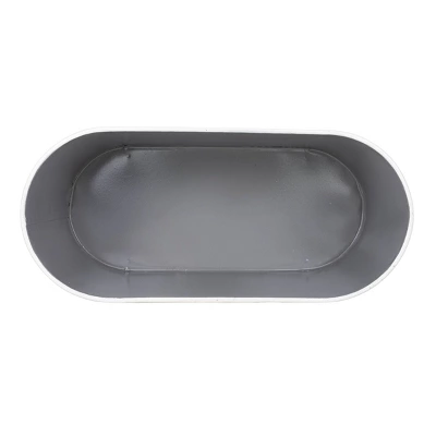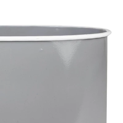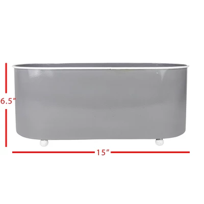 Inspired by traditional plant boxes, but with a flair. Elevated by four white ball feet, this oblong planter is characterized by a clean, high gloss gray lacquered finish and accented by a clean white rim. The neutral coloration offers a simple yet beautiful base for your plants, or for use as a decorative storage bin. Great size for gardening tools, or bathroom essentials.