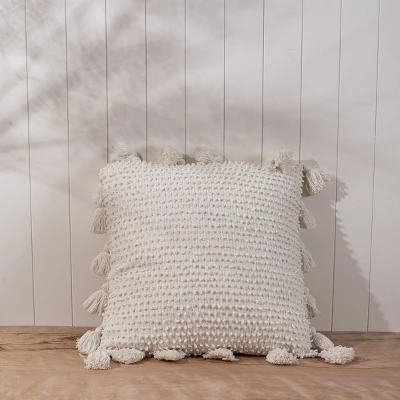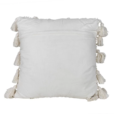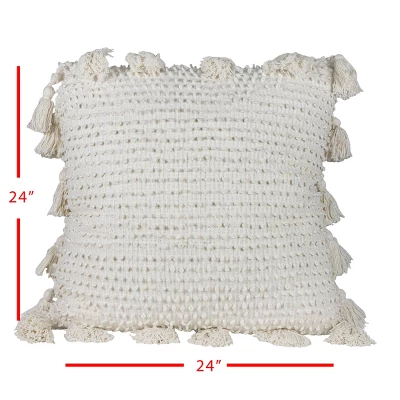 Elegantly soft and cozy, this large, oversized pillow from Foreside Home & Garden is a textural addition to your pillow selection. The unbleached, cream color is given interest with small boucle knots and oversized tassels at each of the edges. This soft and subtle throw pillow is hand-woven by artisans in India.