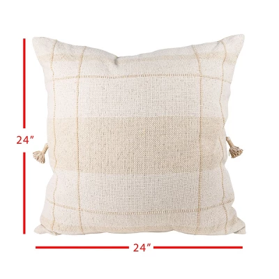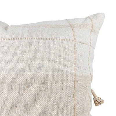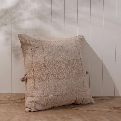 This large neutral pillow is a traditional one with cozy, casual vibes. The perfect size for layering or to use as a floor cushion. The minimalistic brown plaid is both neutral and welcoming. With soft tones of tan and cream, this pillow will easily transition from season to season. Hand woven by artisans in India.