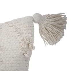 A traditional style pillow that will stand the test of time from Foreside Home & Garden. Woven with tones of white yarns and pulled knots in a diamond pattern add textural details. This is a great neutral, textural piece with fun, chunky tassels. Create a cozy statement with other neutral textiles or layer in with colored pillows. Hand woven by artisans in India.